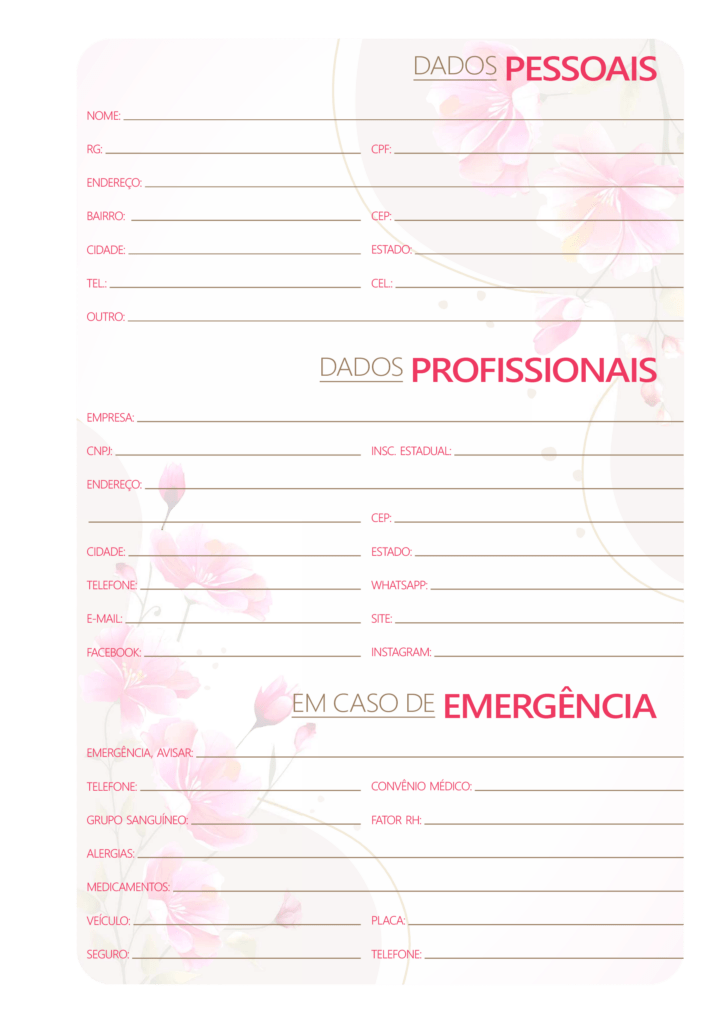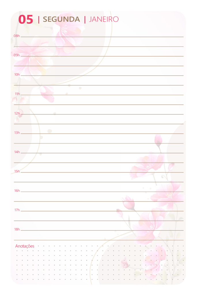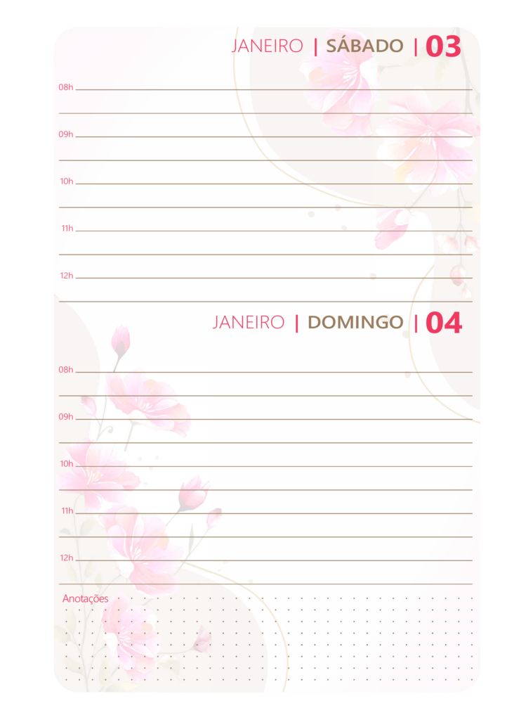 Mas não para por aí! O pacote também oferece 2 modelos de miolo para agenda, um com páginas lindamente decoradas com flores e o outro clean para você imprimir ou personalizar .