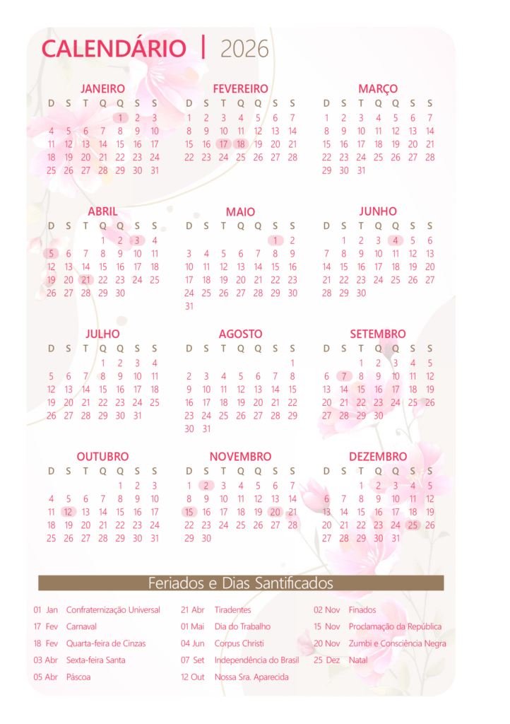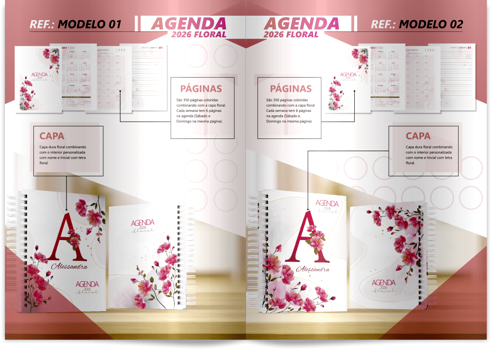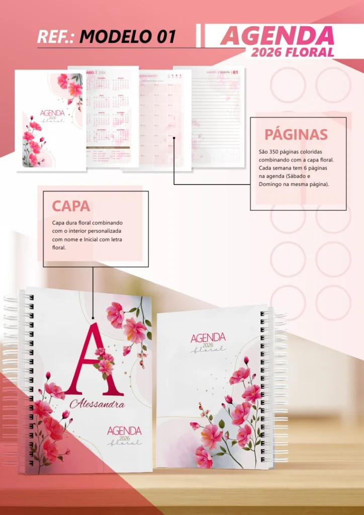 Apresentamos o pacote “AGENDA 2026 FLORAL”, uma coleção completa de arquivos projetados para ajudar profissionais a oferecerem agendas personalizadas e encantadoras aos seus clientes. Com o pacote “AGENDA 2026 FLORAL”, você terá todas as ferramentas necessárias para criar agendas exclusivas e promover o seu trabalho com estilo.